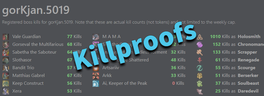 Generate your personal killproof link that captures raids, fractals, strikes and your preferred classes - not limited to the weekly cap.